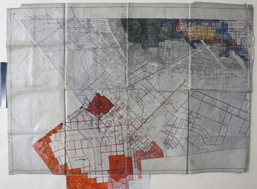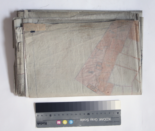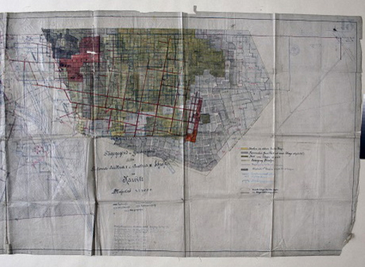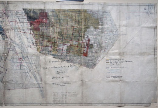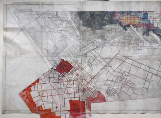 Rukopisná kolorovaná mapa z mostecké důlní lokality na škrobovém plátně, od neznámého autora, bez uvedené datace (1. pol. 20. stol.).